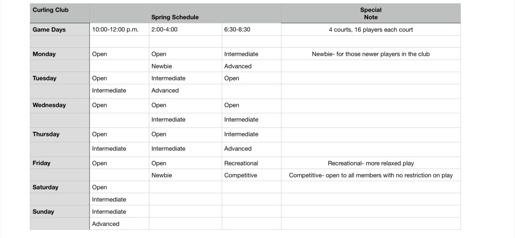 If not enough players signed up, sessions will be cancelled at the discretion of the Club Executive. Notice will be sent via EZin.